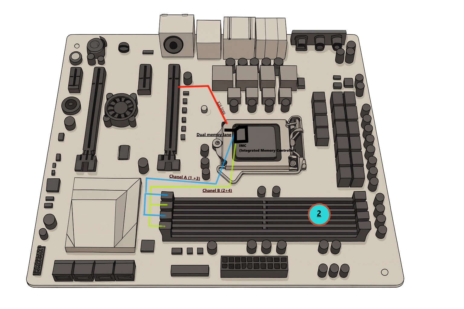 The link between the CPU and the DIMM slots is the memory bus - a direct, high-speed channel with separate lines for: