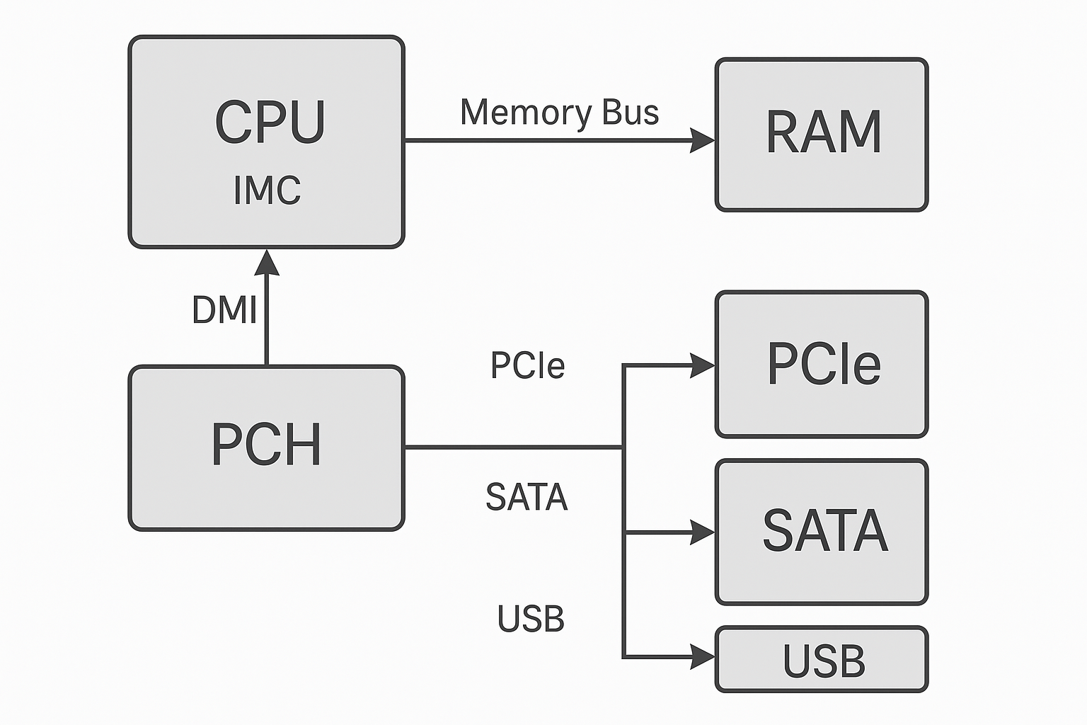 - Old systems had separate chips; now the CPU absorbed the northbridge (memory controller + PCIe lanes).