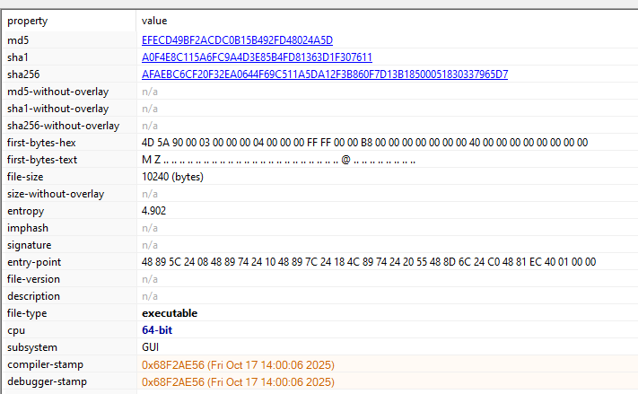- Persistence: It establishes persistence by adding a "HKCU\Software\Microsoft\Windows\CurrentVersion\Run" REG_SZ entry with a random short name, pointing to the executable.