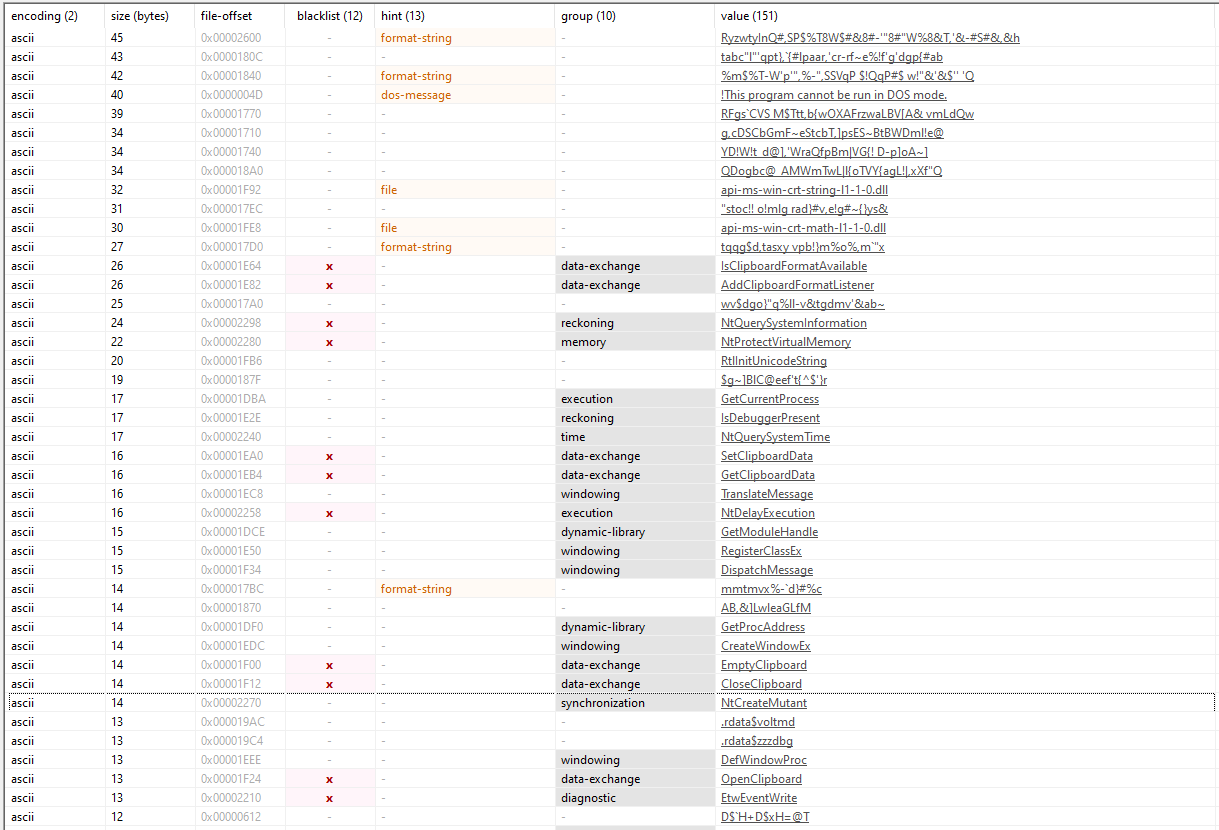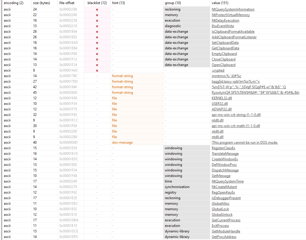 regions, anti-debug and sandbox gating, and a message-loop-based clipboard listener for core hijacking