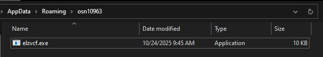- File Operation: The payload is initially written to %APPDATA%\\osn10963\\elzvcf.tmp and then renamed to elzvcf.exe.