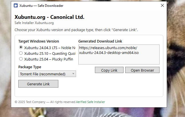 In mid-October 2025, the Xubuntu website's download section was compromised. Attackers replaced legitimate download links (torrents/zip) with a malicious archive containing a fraudulent "Xubuntu - Safe Downloader" package. This archive included a Windows executable (identified as TestCompany.SafeDownloader.exe / elzvcf.exe) and a fake Terms of Service file. Security researchers and community members quickly flagged the executable as malicious.