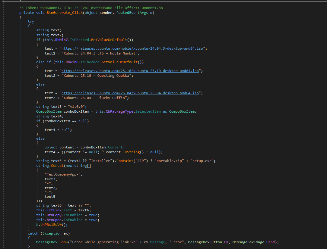 BtnGenerate_Click composes a decoy download URL and populates TxtLink, BtnOpen_Click calls Process.Start to