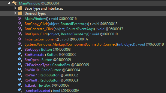 This component operates as a WPF application with a seemingly legitimate user interface, where buttons are the only active elements. Upon clicking "BtnGenerate_Click," it invokes "W.UnPRslEqVw()," which functions as the actual loader.