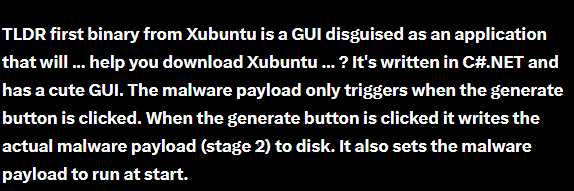 - Spoof GUI: Displays a fake installer interface with the text “Target OS: Xubuntu” to appear legitimate during execution.