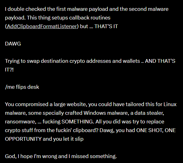 Regarding the malware itself, if we are to credit the assessment by "smelly" from VX-underground which I personally do, the complexity of the payload appears to be minimal. As per his post (link: https://x.com/vxunderground/status/1979885711579865307):